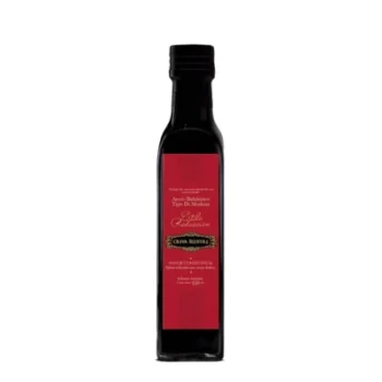 Es un vinagre de vino con mosto de uva. Su estilo italiano le da un sabor equilibrado con matices nobles y deliciosos. El aceto balsámico proviene del proceso del cual se obtiene un almíbar del mosto de la uva, que se deja fermentar hasta que se convierta en alcohol y después en ácido acético a través de un proceso de oxidación. Posteriormente se deja madurar en barriles de distintas maderas por diferentes períodos de tiempo.